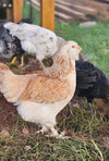 Salmon Faverolles are a French breed with a calm, friendly disposition, making them great companions for any backyard setup. This breed stands out with their fluffy bearded faces, also called a muffs, five distinct toes, and feathered shanks. These charming birds are known to lay eggs with a light brown or even peachy-pink colored shells, adding a touch of beauty to your egg basket!